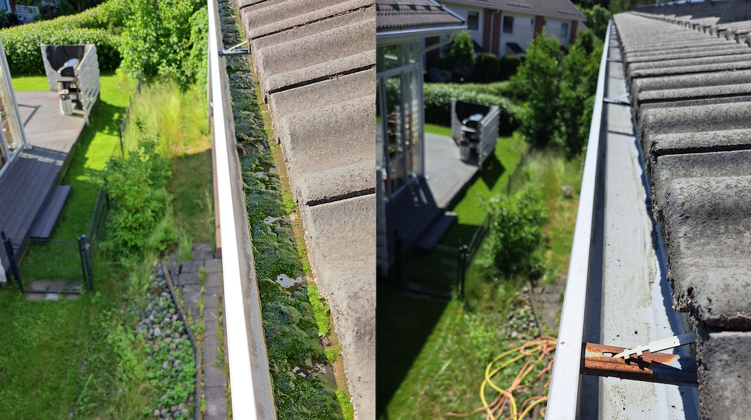 Alla kuvapari ennen rännien puhdistusta ja sen jälkeen.