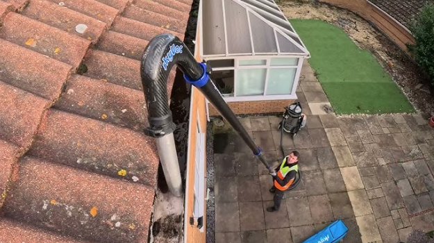 Käytän erikoisvalmisteista SkyVac -ränni-imuria, jonka putkisto yltää jopa 12 metrin korkeuteen. Sen avulla työ sujuu turvallisesti ja tehokkaasti maasta käsin. Imurin putki on varustettu kameralla ja näytöllä, joten näen jatkuvasti miten työ etenee ja voin olla varma siitä, että puhdasta tulee koko matkalta.